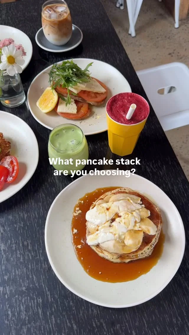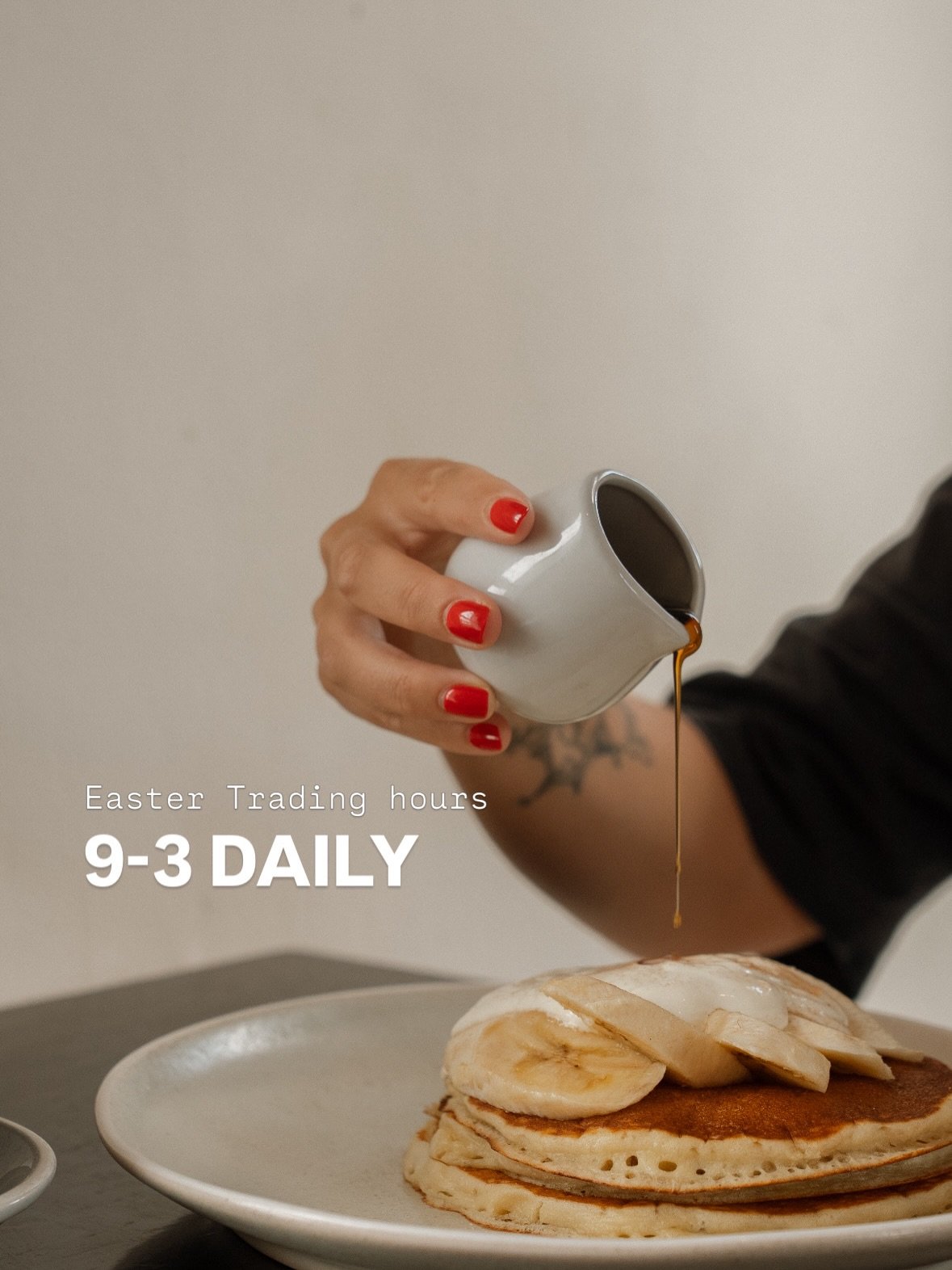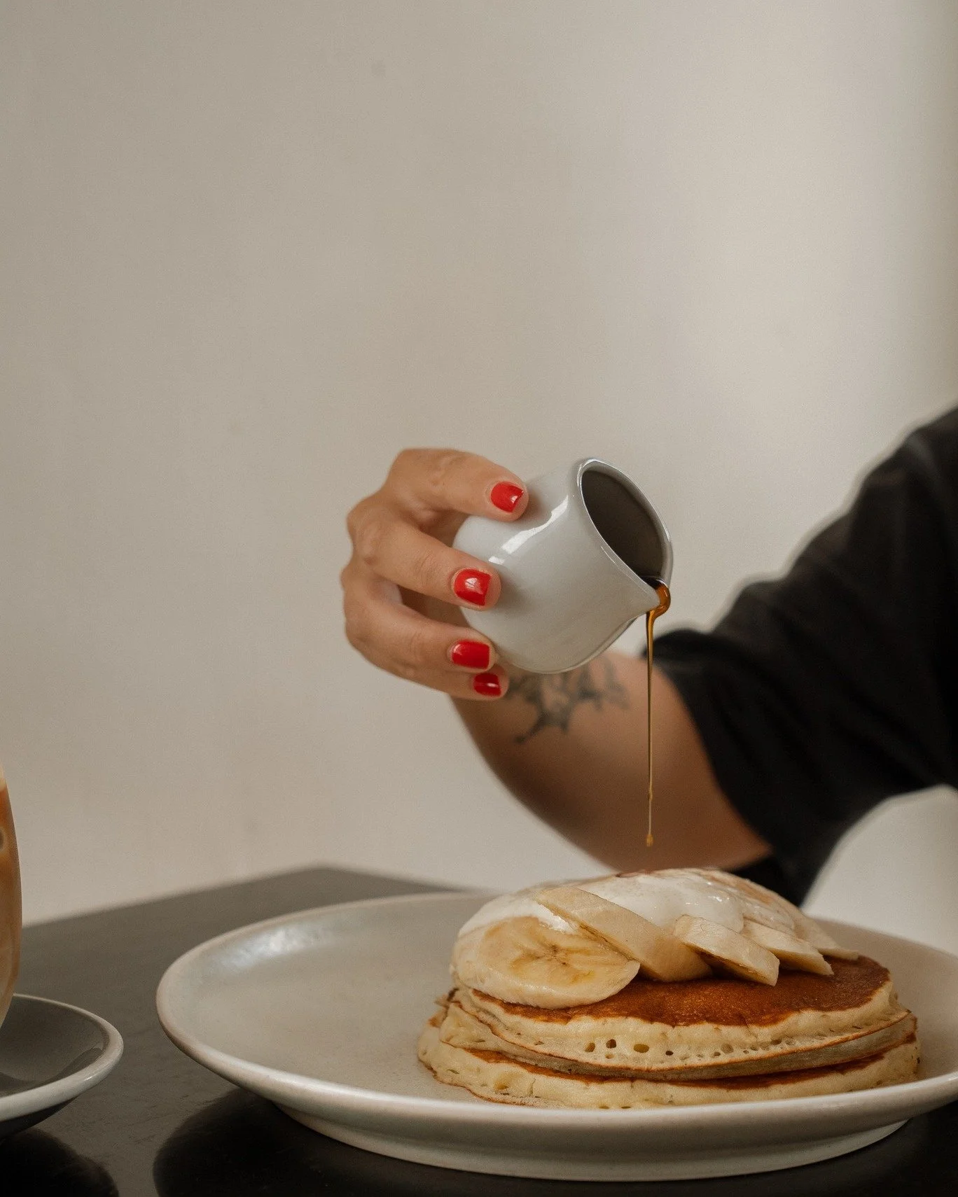 buttermilk pancakes served with fresh banana, yoghurt & organic maple syrup