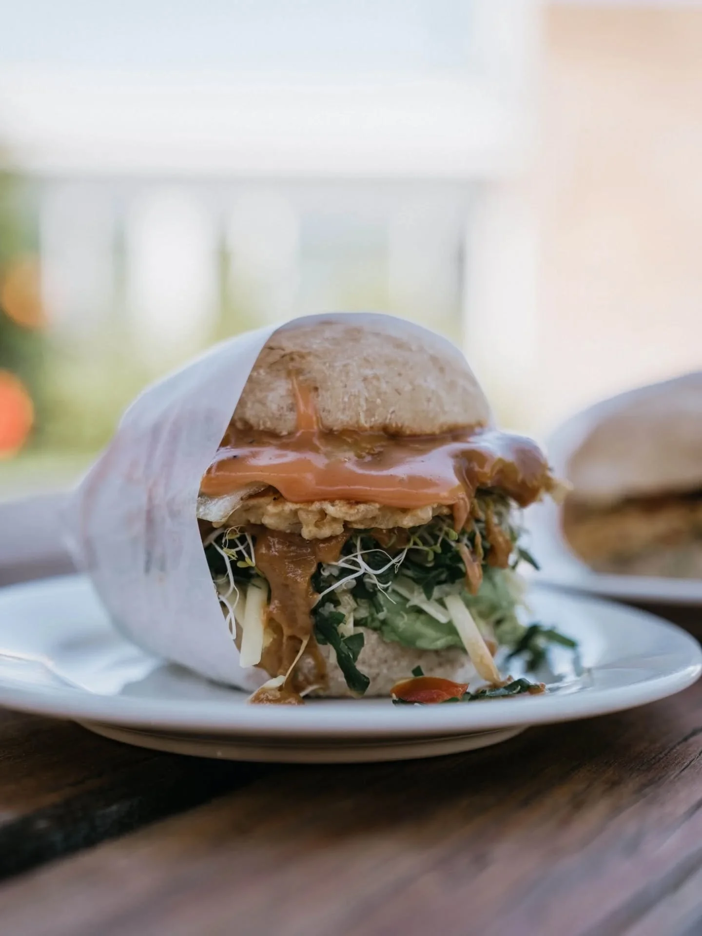 mixed grain patty, fried onion, avocado, cheese, tabouli, sprouts, special sauce & peanut sauce on a toasted wholemeal roll - our most popular burger!