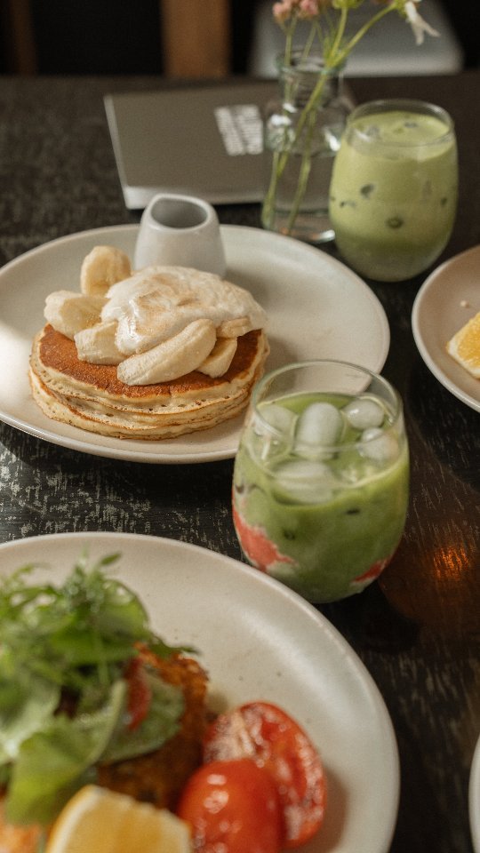 buttermilk pancakes served with fresh banana, yoghurt & organic maple syrup
